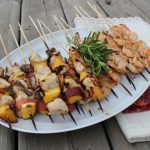 If your skewers are wood, soak them in water for at least 30 minutes before using. Whisk together all of the ingredients except chicken & peaches, in a small dish. Add about half the marinade to a ziplock bag, then drop in your chicken cubes. Close and let sit at room temperature for at least 30 minutes or in the refrigerator up to 4 hours before using.