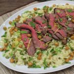 To serve, spread couscous out on a platter. Sprinkle on sliced scallions, chick peas, mint and parsley. Top with sliced steak. Add pepitas and leftover lemon zest.