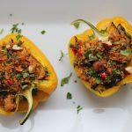 Carefully spoon quinoa mixture into each pepper half. There should be enough to fill each one to just slightly heaping with a few bites leftover for the cook.